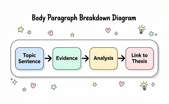 | Body Paragraphs | 3–5 paragraphs. Each paragraph has: topic sentence, evidence, detailed analysis, and link to thesis. Address at least one counterargument if relevant. |