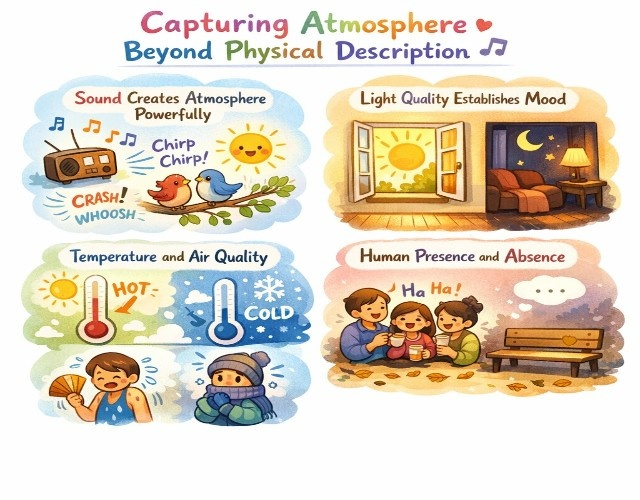 Physical details establish place, but atmosphere makes it memorable. Two writers can describe the same room with identical physical details and create completely different feelings based on how they handle atmosphere.