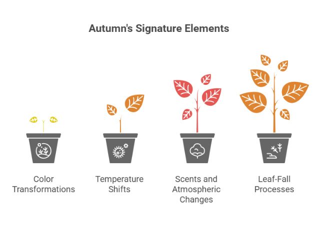 Organize autumn descriptions temporally—early, mid, and late autumn—tracking seasonal progression. This organization emphasizes autumn's transitional character naturally. Start with summer's ending (early autumn), proceed through peak transformation (mid-autumn), and conclude with winter's approach (late autumn).