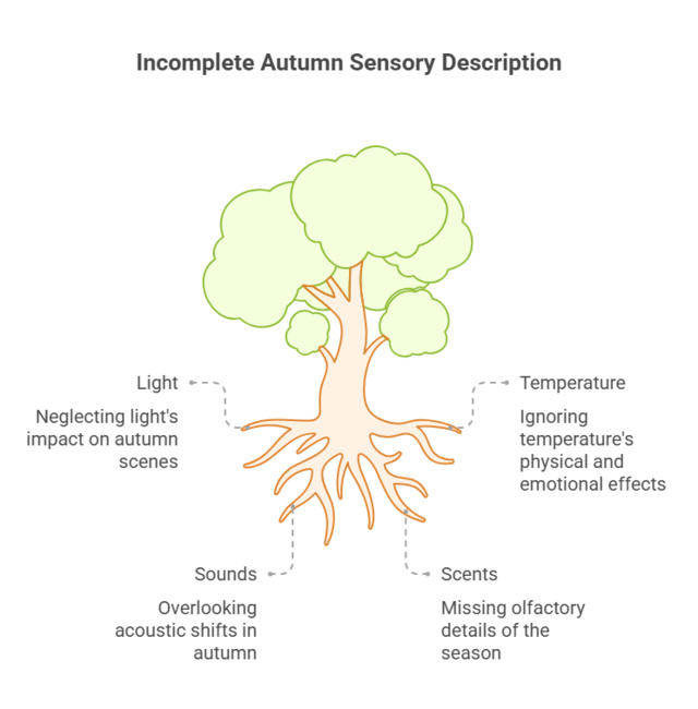 Vision dominates autumn descriptions understandably given spectacular color displays. However, autumn engages all senses distinctively. Overemphasizing visual elements while neglecting sounds, scents, temperatures, and tactile sensations creates incomplete autumn portraits.