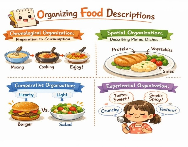 Organize food descriptions chronologically from preparation through eating. This structure naturally incorporates multiple sensory stages: raw ingredients, cooking smells and sounds, plating and presentation, first bite impressions, eating experience, and aftertaste.