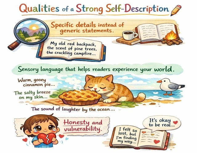 The best self description essays are honest, specific, and vivid. They show rather than tell. They use sensory details to bring experiences to life. They reveal something meaningful about who you are without announcing "I am X type of person."