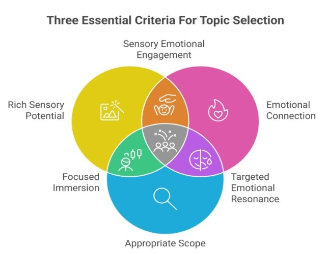 - Rich Sensory Potential: Can you engage at least 3 of the 5 senses? If you can only describe what something looks like, pick a different topic.