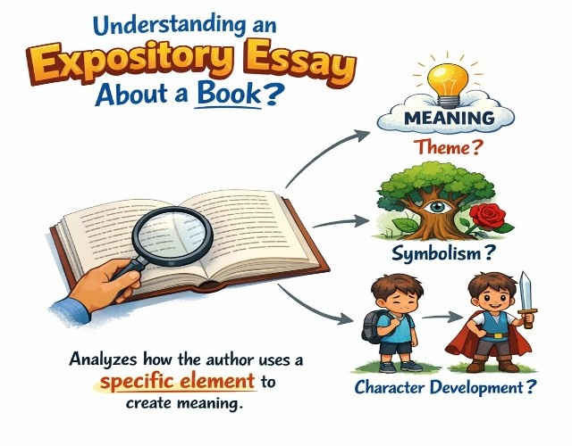 An expository essay about a book analyzes how the author uses a specific element, like theme, symbolism, or character development, to create meaning.