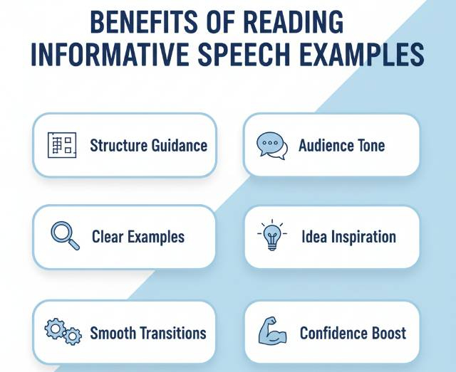 Together, these benefits make informative speech examples a practical learning tool for producing clear, well organized, and audience-friendly speeches.