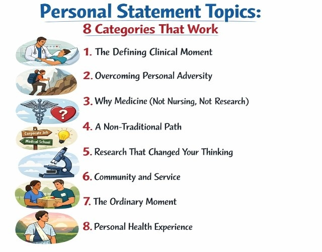 Here are the 8 categories that produce strong personal statements, and what each one needs to avoid becoming generic.