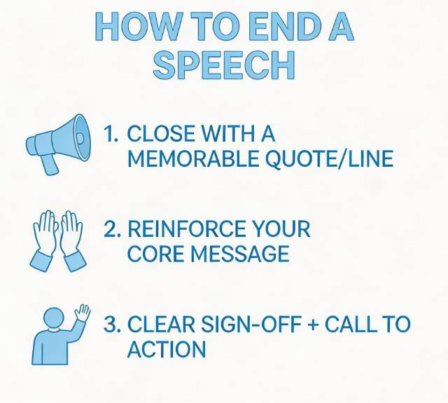 The most effective endings feel intentional, confident, and aligned with the tone of the speech. When you plan your closing as carefully as your opening, you ensure your speech doesn’t simply end but lands.
