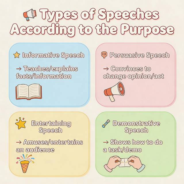 Well, we just covered what the types of speeches are according to the purpose. Now we will jump to different speech types according to their delivery!