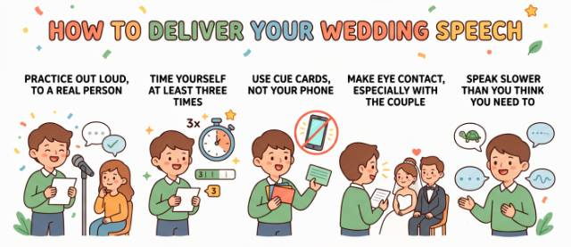 If public speaking anxiety is a real concern for you, Toastmasters has practical resources that go beyond wedding speeches. And if writing the speech itself is the bigger obstacle, check out the resources at The Knot or consider having it written professionally.