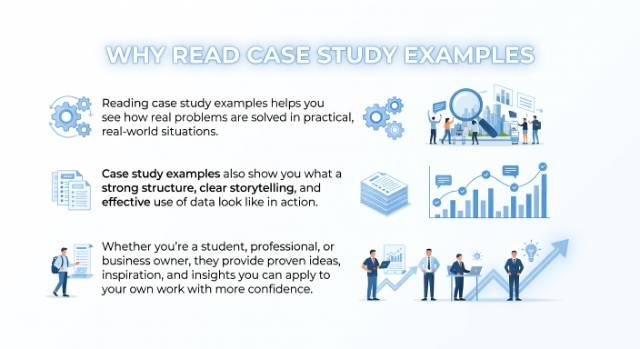 For small businesses, case studies might look at things like content marketing, social media strategies, or improving products for potential customers. They show how businesses attract customers and grow over time.