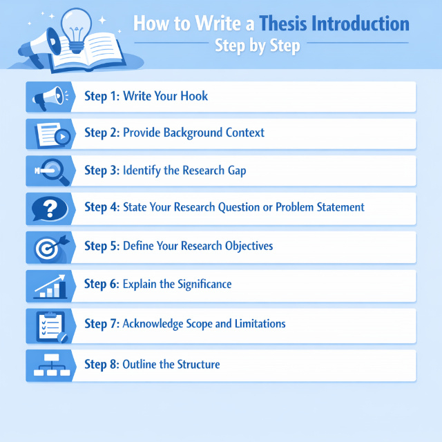 A thesis introduction is the first chapter of your thesis, placed after your table of contents and before your literature review. It establishes the research context, identifies the problem you're investigating, and gives your reader a clear picture of where the thesis is going.